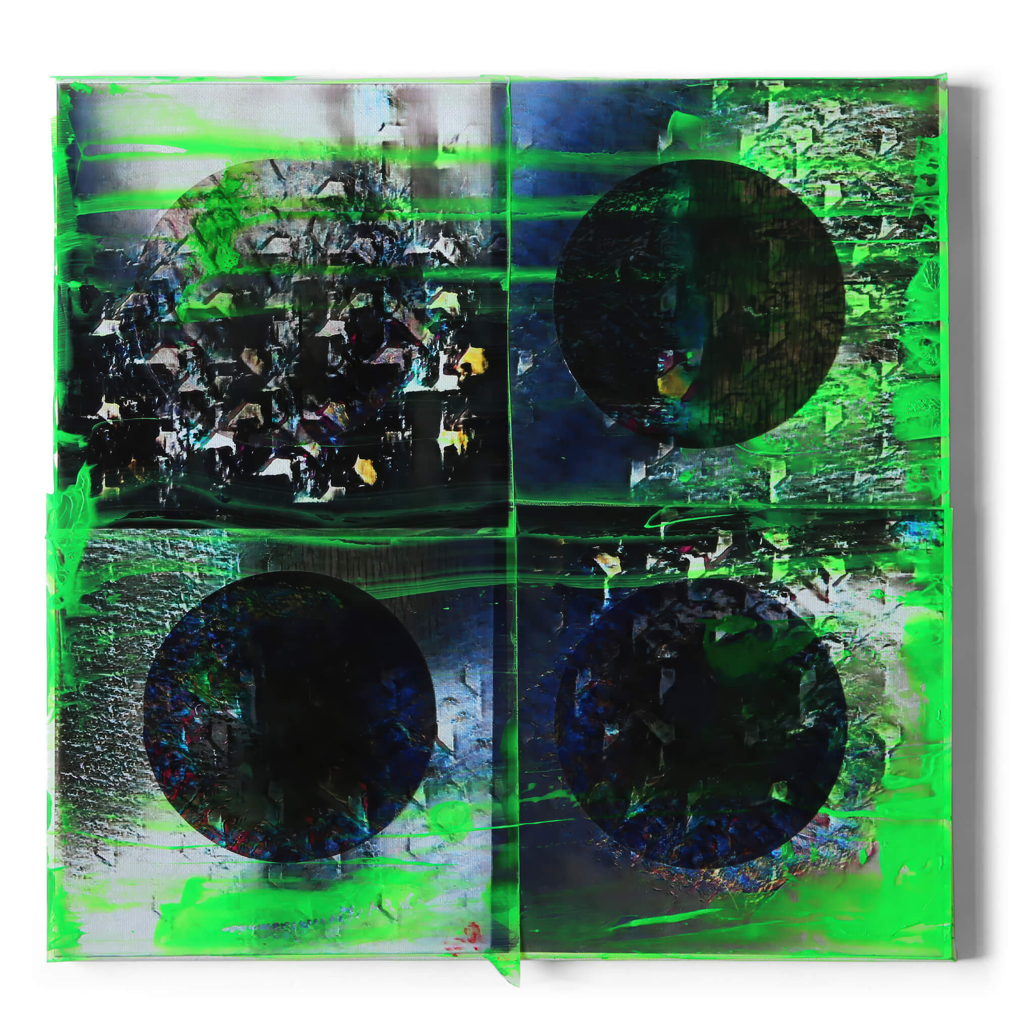 The unpredictability of artificial intelligence generates results influenced by technology and brain-constructed reality, breaking the viewer’s perception into a multitude of possibilities. The more images involved, the more spontaneous the results. The machine and the artist are forced to collaborate and exist in constant symbiosis. Nero Cosmos creates work that mediates between a real and an abstract world, seemingly creating threads of logical patterning in the midst of random and chance.